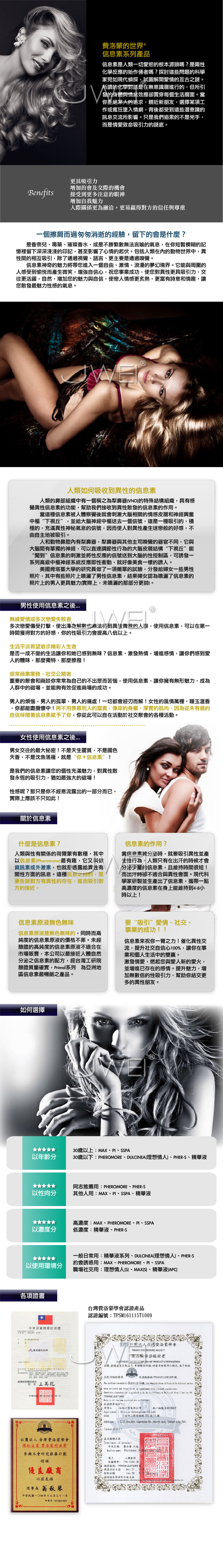 什麼是信息素?人類與性有關係的荷爾蒙有數種,其中以信息素(Pheromoe)最有趣,也就是透露給異性有關性的訊息。目的在於告訴對方有異性的存在,進而吸引對方接近,提昇新的愛火。讓你們感受到愛人的體味,那麼獨特,那麼撩撥!