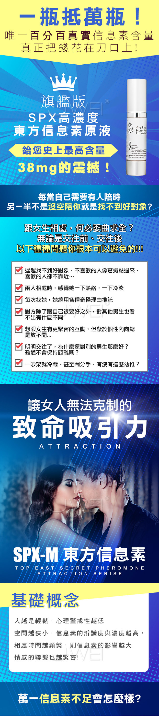 SPX旗艦版東方信息素原液給你使上最高含量的震憾,揭開信息素吸引愛情的秘密!!你相信人與人之間的好感度和心動指數是可以創造出來的嗎??希望吸引異性主動靠近,不再坐冷板凳,提升異性對你的好感度嗎?人類信息素可在對方無法察覺的情況下,增加異性吸引力,舒緩使用者的負面情緒壓力,提升正面情緒增加自信。此款SPX旗艦版-M男性專用讓女人無法克制的致命吸引力!!