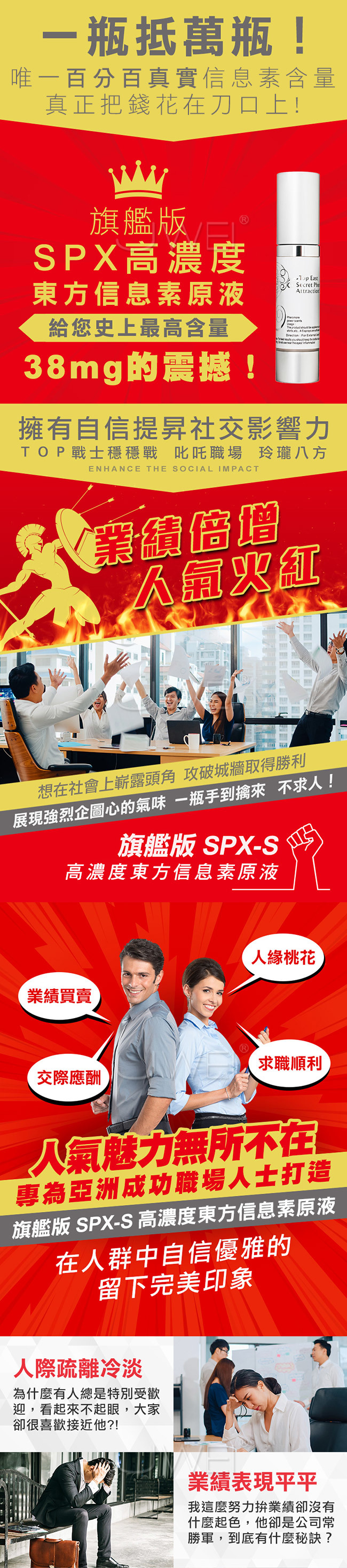 SPX旗艦版東方信息素原液給你使上最高含量的震憾,想在社會上嶄露頭角,攻破城牆取得勝利?此款讓你展現強烈企圖心的氣味,一瓶手到擒來不求人!人類信息素可在對方無法察覺的情況下,增加異性吸引力,舒緩使用者的負面情緒壓力,提升正面情緒增加自信。此款SPX旗艦版-S社交專用讓你自信提升社交影響力~在人群中自信優雅的留下完美印象。