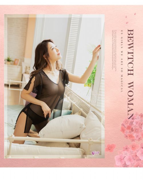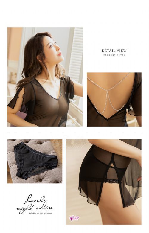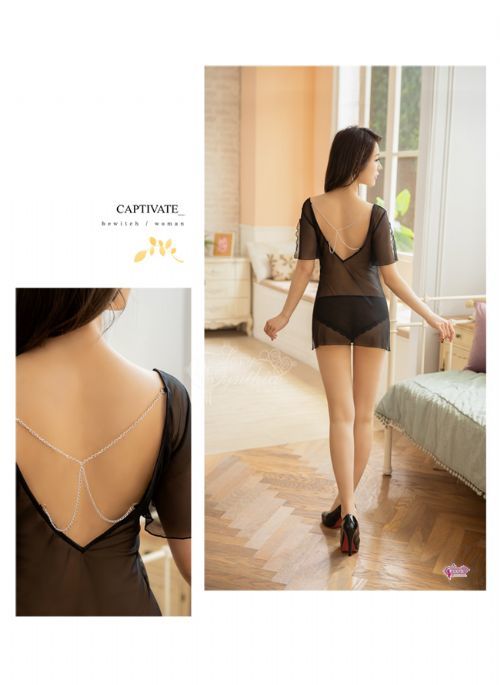 冷豔黑薄紗透視短袖交叉銀鍊美背二件式內褲睡裙
