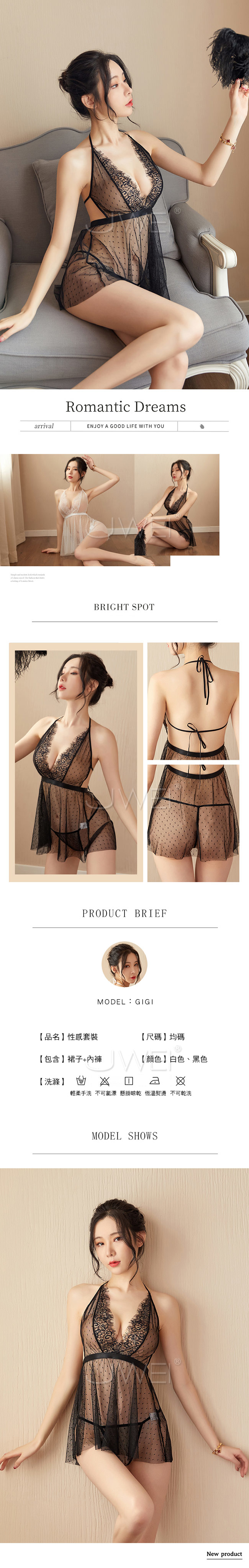 ◇◆午夜倒數.透視蕾絲點點網紗繫帶掛脖睡裙(白色)◆◇