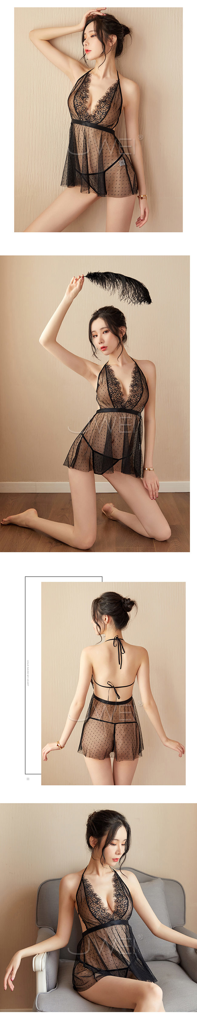 ◇◆午夜倒數.透視蕾絲點點網紗繫帶掛脖睡裙(黑色)◆◇