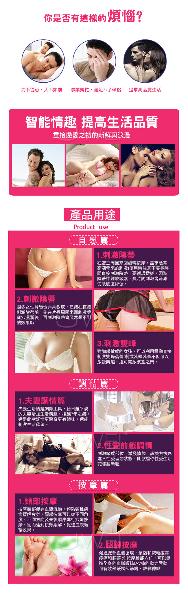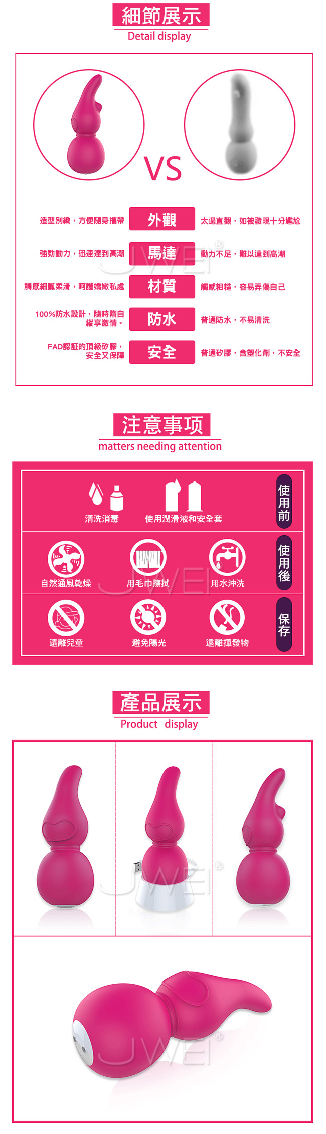 此款由於要進入體內因此對材質要求更高,比起矽樹膠、塑膠而言,矽膠是安全的材質,讓您更安心使用。且靜謐防水設計,保護您的隱私不被發現,如呢喃私語讓你完全沉浸在快感之中,不受場地所束縛。造型時尚呆萌可愛,頂端可以探入體內刺激G點,頂端的黃金插入角度加上產品強烈震感,可以對G點達到很好的刺激按摩。還有令人愛不釋手一體設計,擺脫有線束縛。