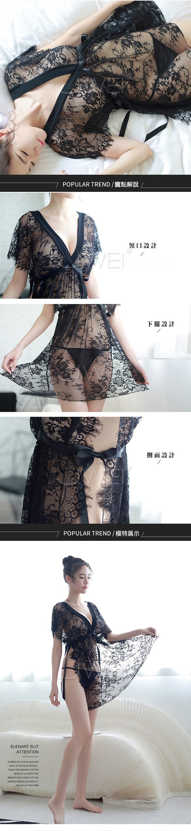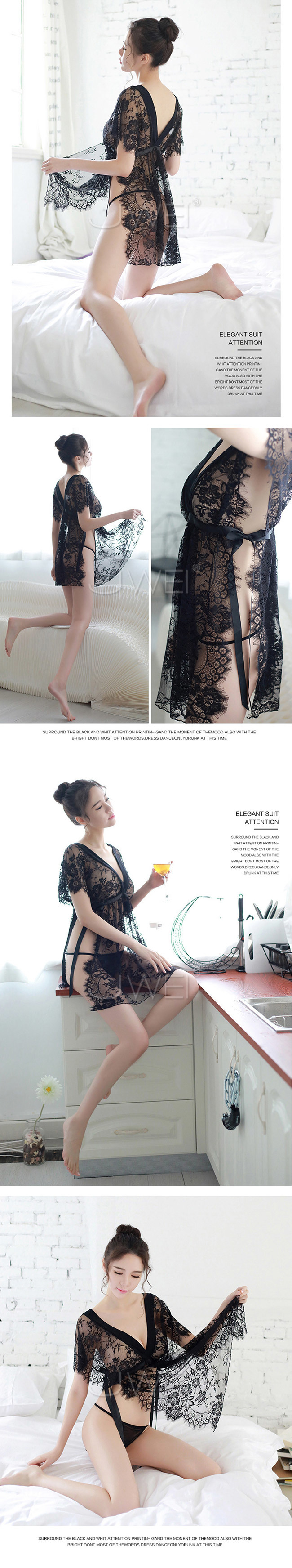 夜幕戀曲.V領睫毛蕾絲側開衩情趣睡衣