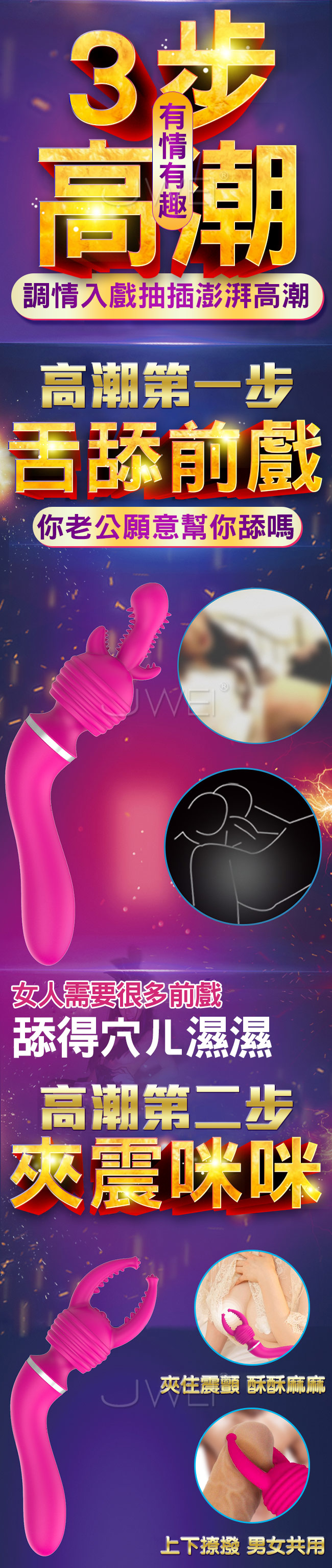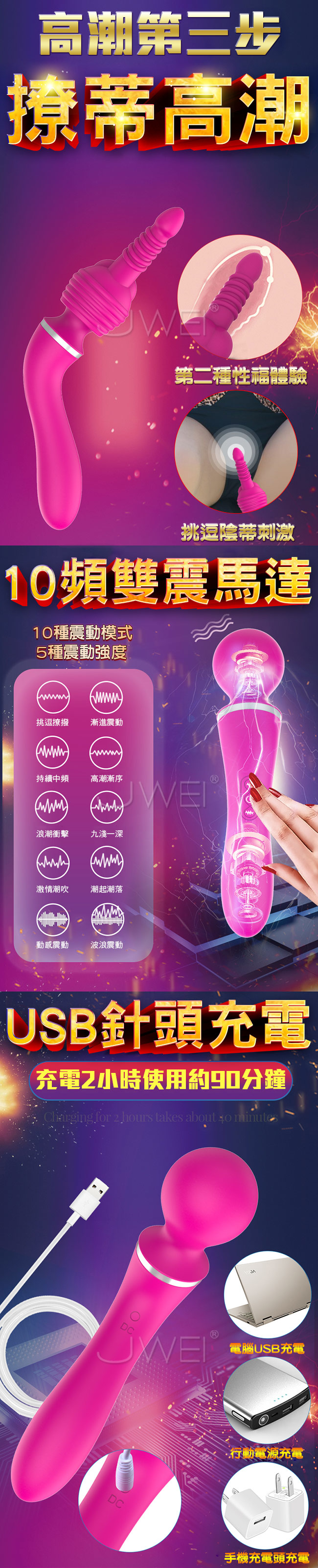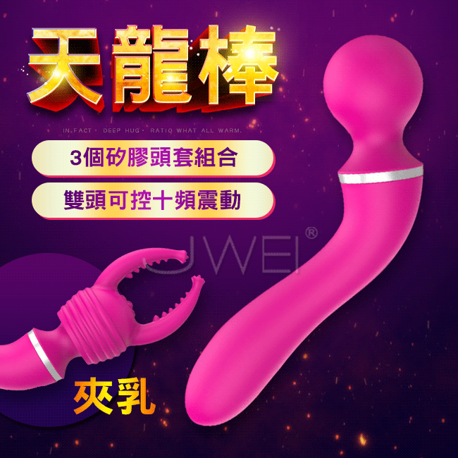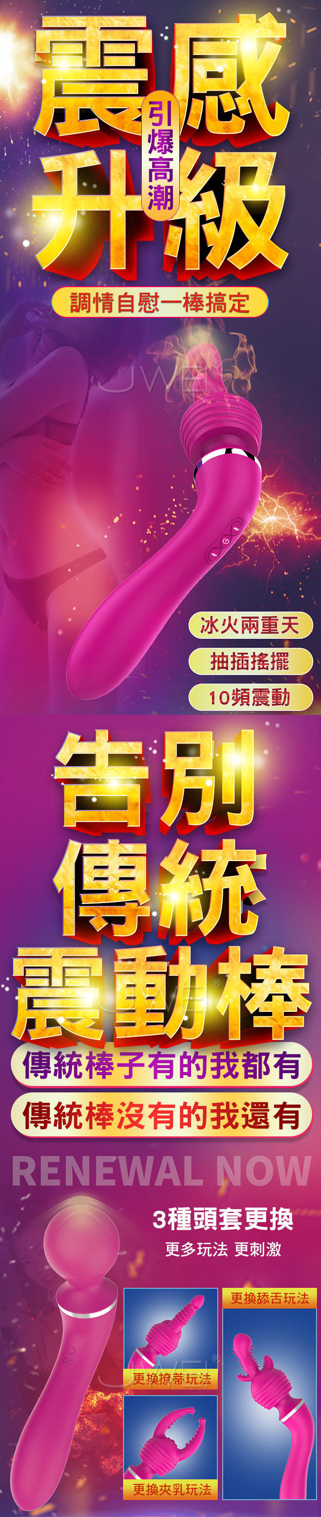 調情自慰一棒搞定告別傳統震動棒,擁有3種頭套更換讓您有更多玩法更刺激不管是夾乳、舌舔、撩蒂一棒搞定。擁有10段變頻雙馬達雙頭可控讓您可大頭愛撫小頭刺激蜜穴喔~採用USB充電讓您免去裝電池的困擾隨充隨玩~