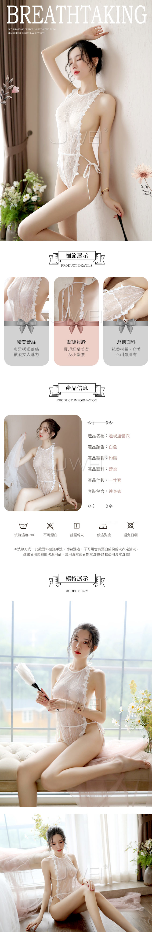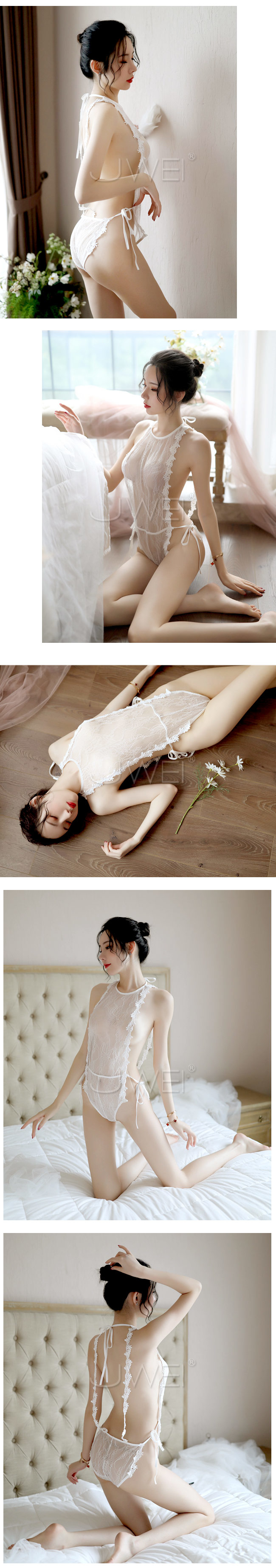 ◇◆微熱低語.透視蕾絲鏤空高衩綁帶連體衣(白色)◆◇