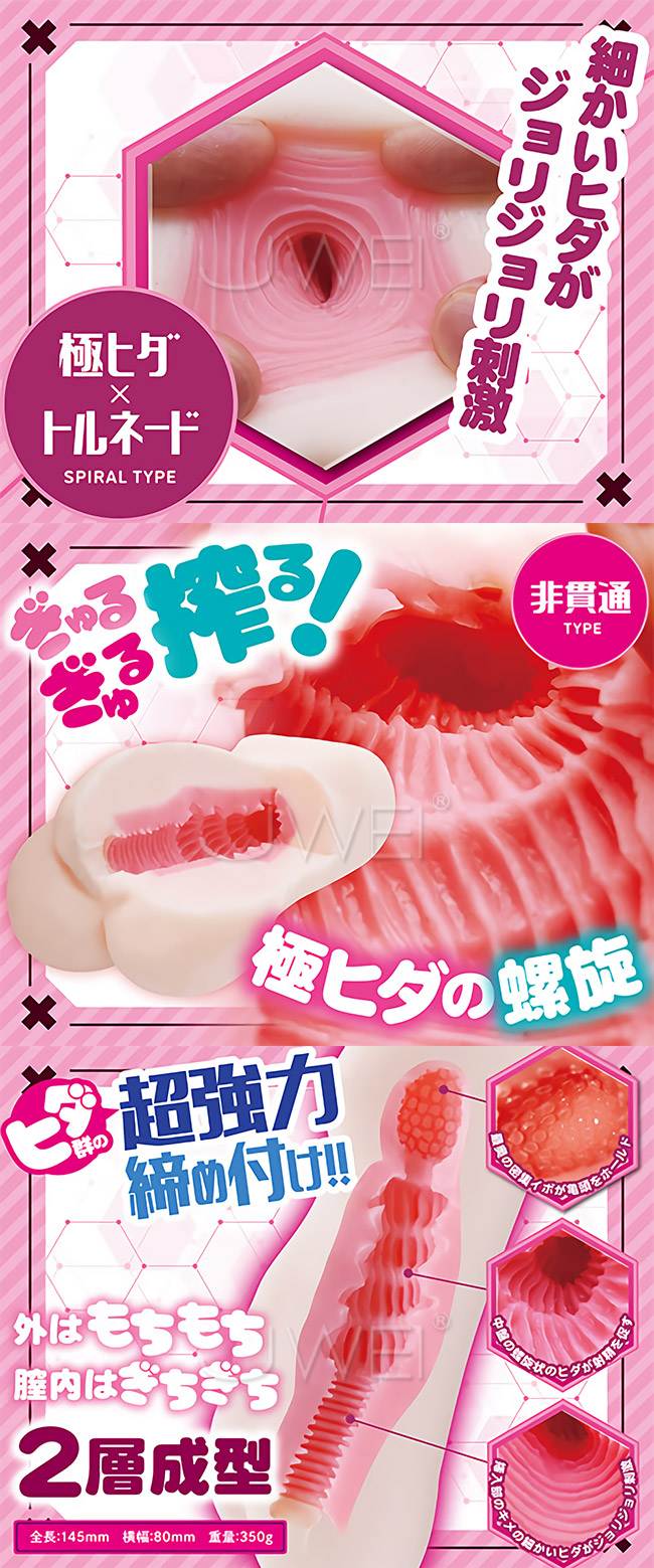 未発達なツルツルなアソコと、AAカップバストがとってもカワイイ、つるぺた萌えのロリ系オナホ。 外はもちもち、中はギチギチな二層構造素材のオナホで、極ヒダxトルネードがギュギュッとアソコを締め付けます。 挿入口付近のキメの細かいヒダヒダがジョリジョリ刺激、中盤の螺旋状態のヒダが射精を促します。そして、最奥の密集イボが亀頭をホールドし、たまっている精液をぶちまけちゃってください。 人間の性にまつわるあらゆる事を日々研究する理系女子のカラダを頬張りつくそう!