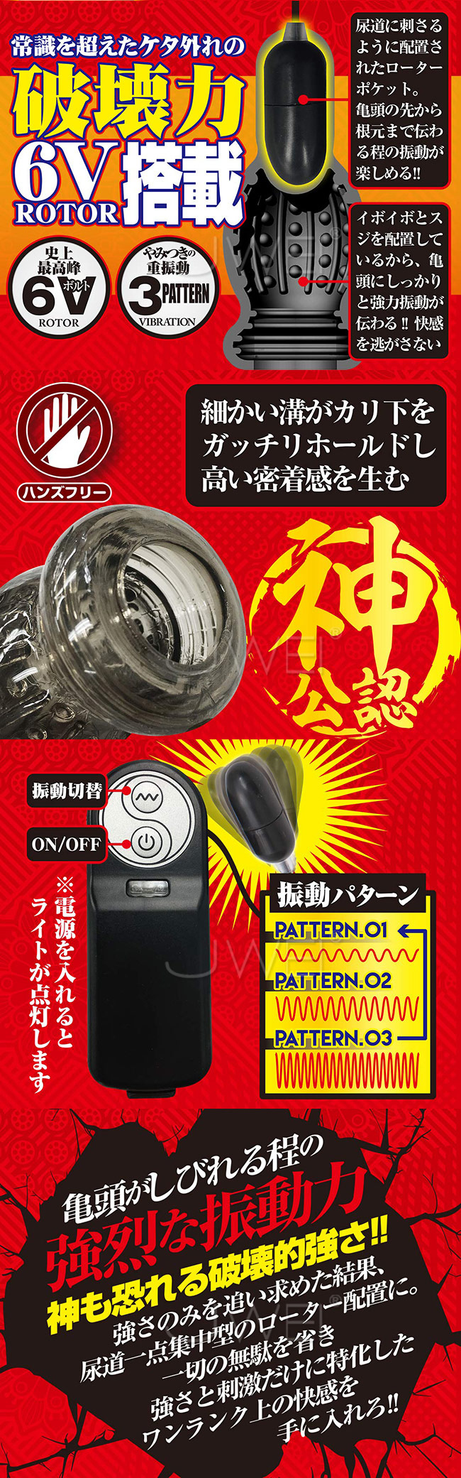 神次元へ突入した亀頭オナニー! 常識を超えたけた外れの破壊力の6ボルドの重振動を亀頭で感じられます。脳天から強烈な快感が突き抜ける深い刺激を体感頂けることでしょう。ローターは3段階のパターンを装備しているのですが、ボタンプッシュで簡単にコントロール可能です。亀頭に被せるキャップの内側には、イボイボとスジが施されているので、振動によって擦られる感覚をフォローします。挿入口には細かい溝があり、カリ首下をしっかりホールドします。ソフト素材と造形により、密着感が高く振動を逃すことなくダイレクトに伝えます。ハンズフリーで楽しめる亀頭オナニーが楽しめるだけでなく、キャップからローターを外して、強力パワーのシングルローターとしても大活躍。