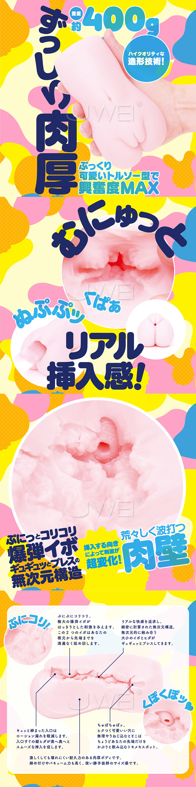無次元内部構造により超絶リアル快感を楽しめるぷにぷにボンバーです。 片手で持った時にズシッと重みを感じる400gという重量は、挿入した時にみっちりと包み込む包容感を実感できます。 キュッと窄まった挿入口から挿入すれば、縦ヒダがペニスを奥へ奥へと導きます。さらに進むと、ぷにぷにコリコリの巨大な爆弾イボがはっきりとした刺激を与える構造。荒々しく波打つ肉壁は、リアルさを綿密に計算された無次元構造壁で、大小のイボとヒダにギュギュっにプレスされるような刺激は快感です。 最奥部にある小さく可愛らしい子宮口に無理矢理ねじ込めば、あなたの先端部だけをクポッと咥え込むジャストサイズ。 ぷにコリギュウギュウの無次元オナホールを心行くまで堪能して下さい。