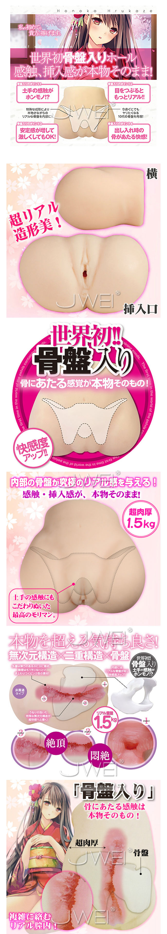 見た目にも感触にもこだわり抜いた、究極のリアル感が味わえるオナホール「初穴 春風ほのか」。 ぷっくり膨らんだこだわりの恥丘は超リアルで、内部に骨盤が埋め込まれているので、感触も挿入感も本物そのもの。 さらに、肉厚の膣内部はしっかりと形状を感じることができ、うねりながら複雑に絡み付く肉壁が全体をまんべんなく刺激して、心地良い絶頂感をもたらします。 幼さの残る容姿からは想像もつかない「絶品の穴」を、たっぷりとご堪能下さい。