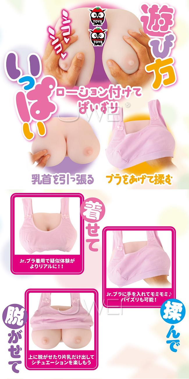 お椀型をした理想的な女の子のおっぱいを再現したおっぱいグッズ。内部のふわとろ素材を外部のソフト素材で包み込み、乳首はほんのりピンク色のコリコリ素材が使われている。可愛いJrブラと200mlローションが付属する。