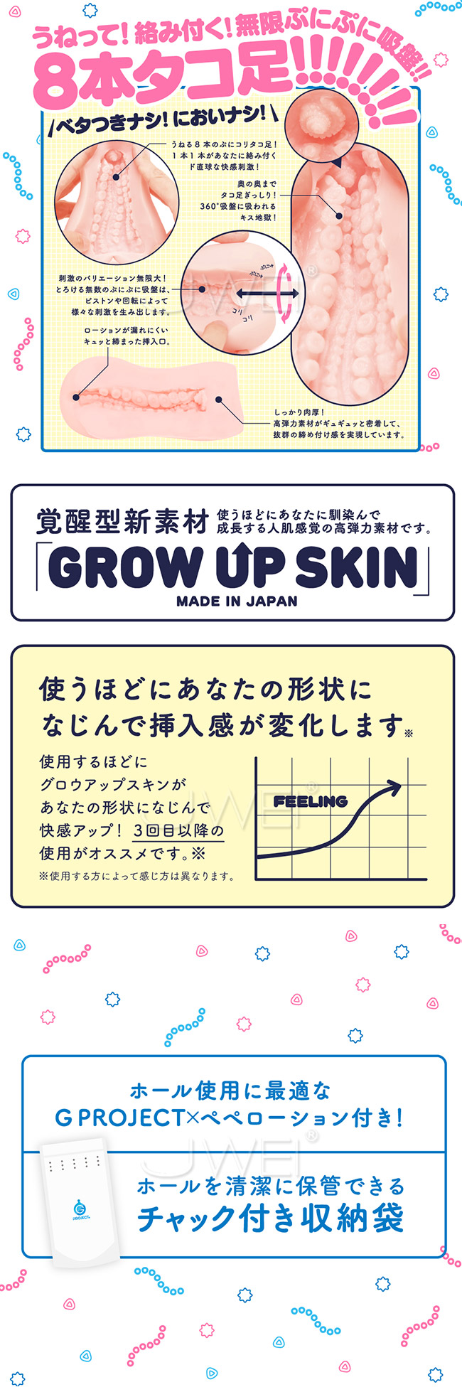 8本のタコの足が内部構造になったような、吸盤デザインの突起の刺激で、異世界体験ができちゃうエロチックオナホ。 しっかり肉厚重量級300gで、うねって絡みつく8本のぷにコリタコ足がド直球な刺激を再現。無数のぷにぷに吸盤とっきはとろける快感。 ピストンしたり回転させたりすることで刺激のバリエーション無限大! 覚醒型素材「GROW UP SKIN」は、使いほどにあなたに馴染んで成長する人肌感覚の高弾力素材です。