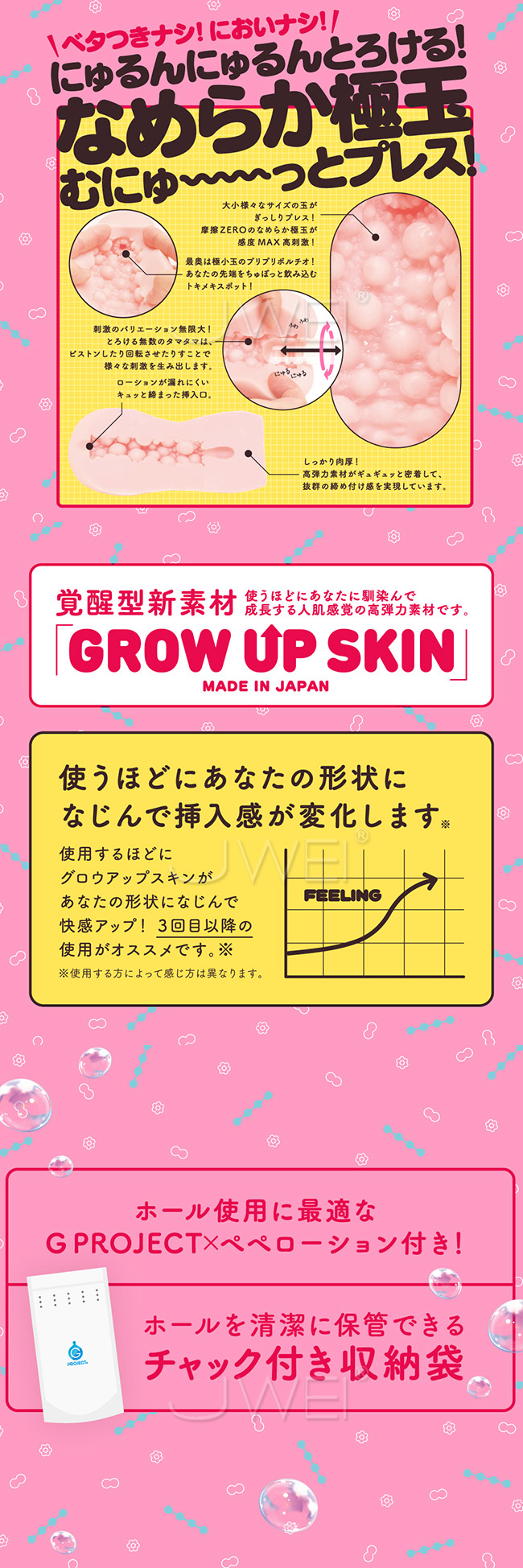 とぅるんとぅるん快感のすっごいタマタマ! しっかり肉厚重量約300g!にゅるんにゅるんとろける無数の極玉がむにゅーっとプレス! 摩擦ZEROのなめらか極玉が感度MAX高刺激!ピストンしたり回転させたりすることで刺激のバリエーション無限大。 覚醒型素材【GROW UP SKIN】は使うほどにあなたに馴染んで成長する人肌感覚の高弾力素材です。