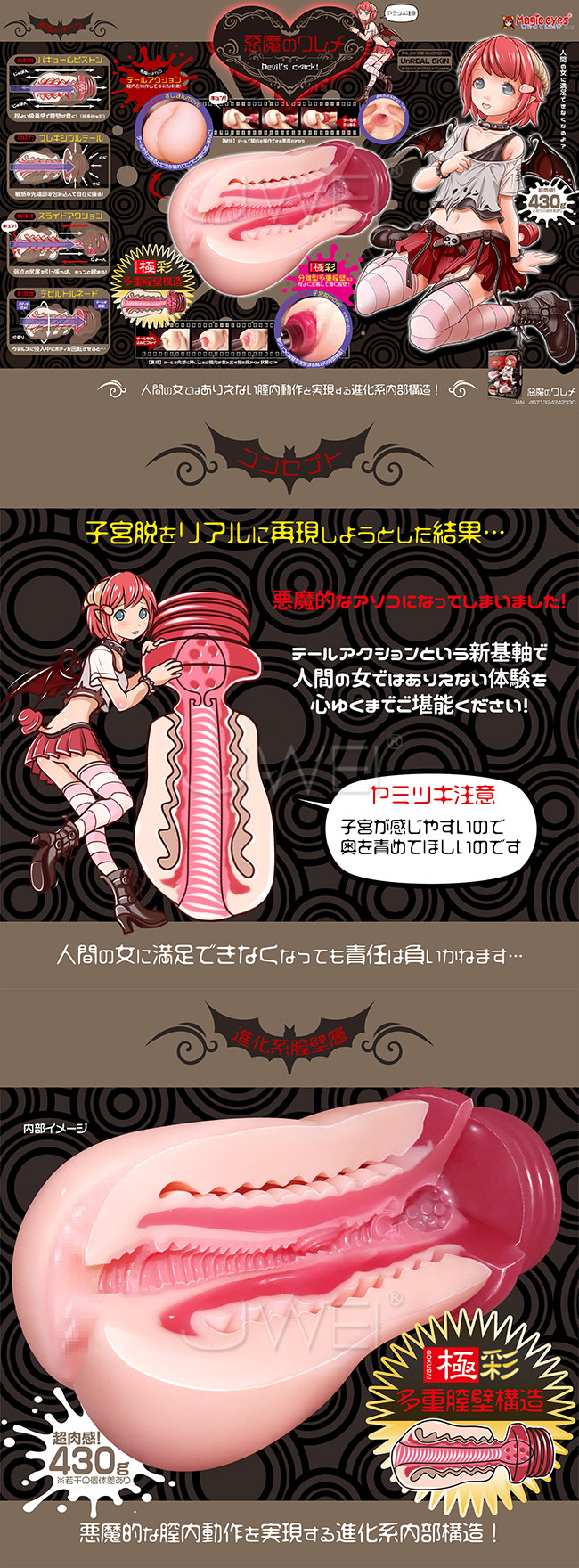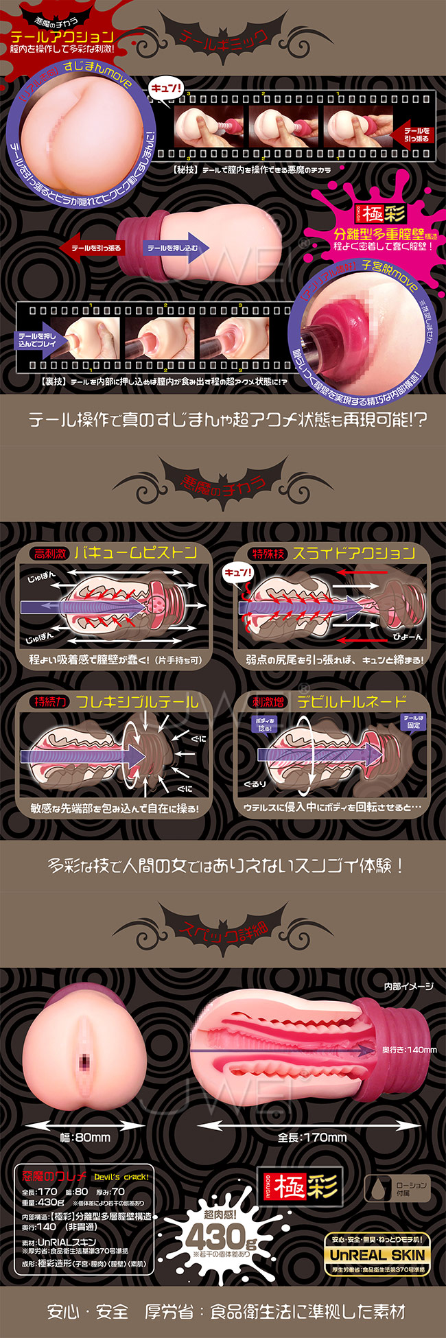 本当の女性ではありえない超複雑な作りの内部構造のオナホです。 子宮脱をリアルに再現しようとした結果、悪魔的な膣内動作を実現する進化系内部構造です。テールアクションという新基軸なので、人間の女性ではありえない体験が可能。 ヤミツキ注意の超絶内部は、女性に満足できなくなっても責任は負いかねます。 デビルトルネード、フレキブルテール、スライドアクション、バキュームピストンなど、多彩な刺激を堪能下さい。