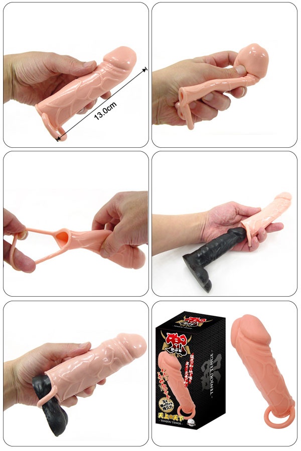 這款附助刺激套,採用肉色彈性軟身物料製造,能增大體積。表面的坑紋是模仿陰莖的血管造型設計,讓女仕們可享受到不同程度的刺激及快感。男士把膠圈套著睪丸可增加持久力。