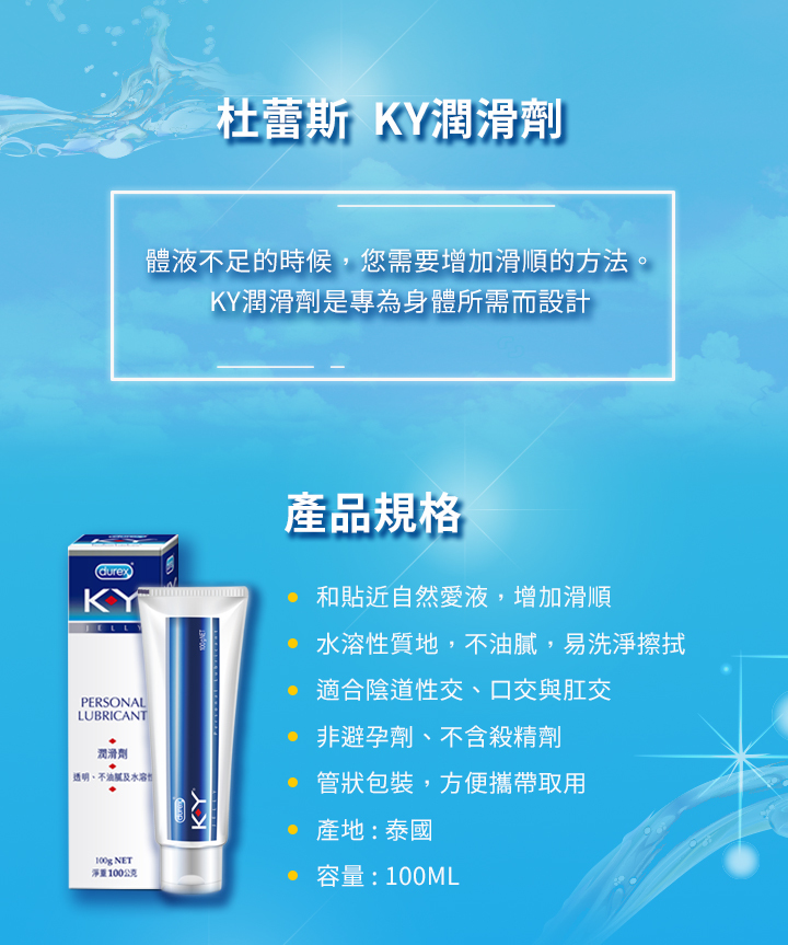 杜蕾斯KY潤滑劑正是根據婦科研究結果而特別生產的人體潤滑補給用品。