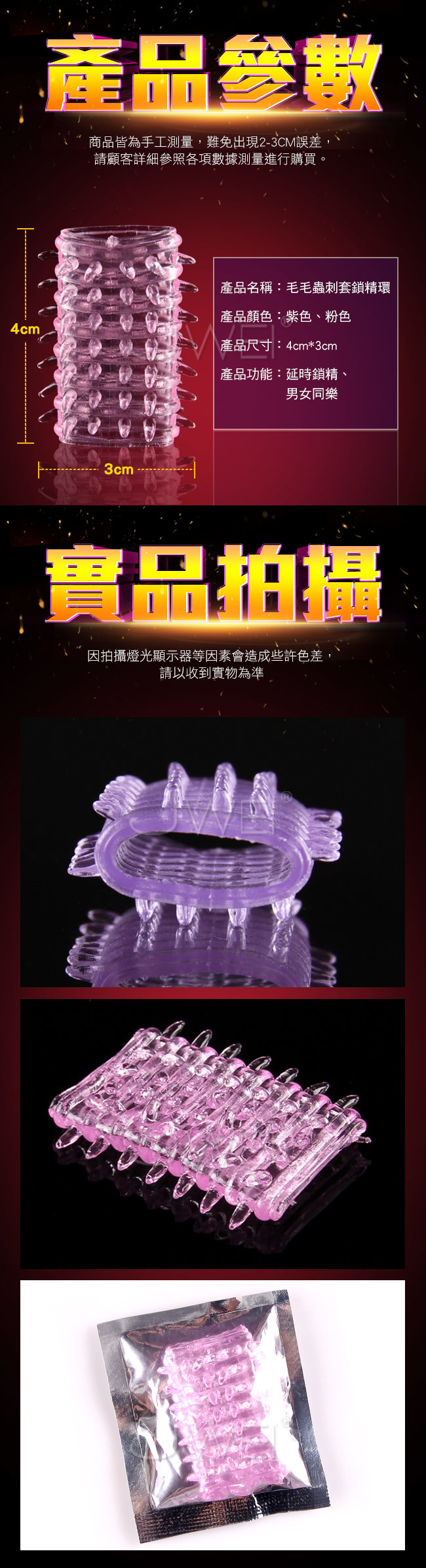 毛毛蟲套環是用特殊醫學材料製作而成的調情用品,做愛時將本品套在男性勃起的陰莖上,,鎖住血液回流,有效延長陰莖勃起時間與增加硬度。套環上擁有小凸刺顆粒可有效刺激女性陰道,使雙方都產生強烈的快感。同時還能產生一定的視覺刺激,讓您慾火焚燒!