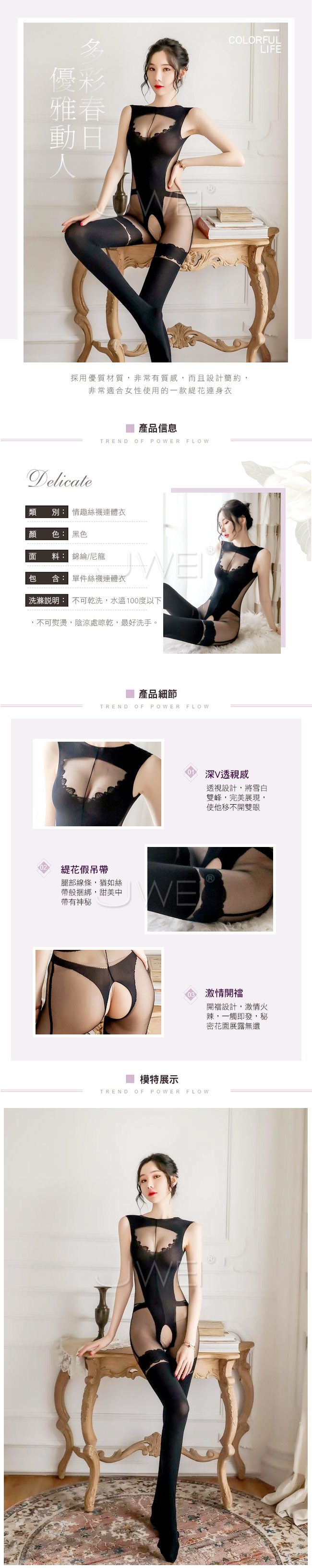 緹花假吊帶將腿部線條,猶如絲帶般捆綁,甜美中帶有神秘~
