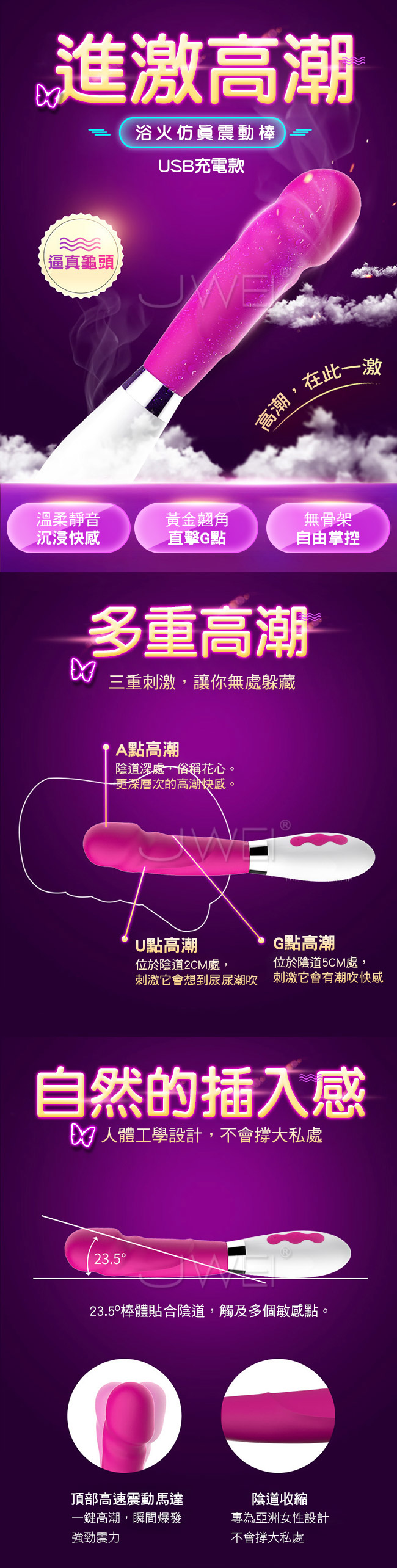 浴火仿真女用震動棒讓您享受真正多重高潮,自然的插入感人體工學設計,不會撐大私處23.5度角設計棒體貼合陰道,觸及多個敏感點。擁有10段變頻高潮迭起,快樂不斷,愛不釋手~~採用貼心靜音防水設計讓您不管在室內、室外,自在使用釋放野性。