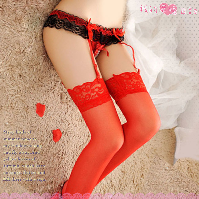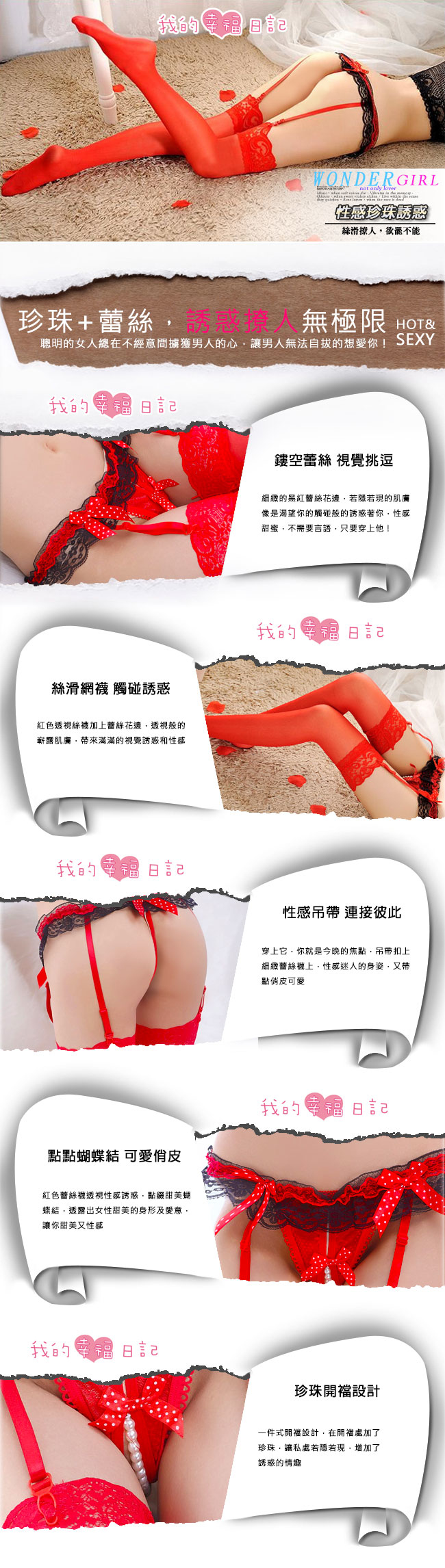 珍珠愛戀‧珍珠開襠吊襪帶 + 大腿蕾絲絲襪(紅)
