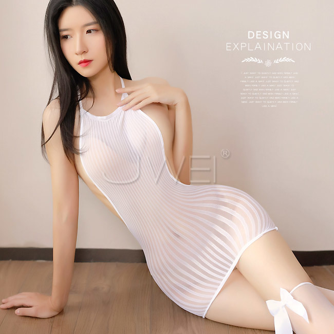 緋聞女王.性感條紋掛脖繫帶透視包臀連身貓裝(白色)