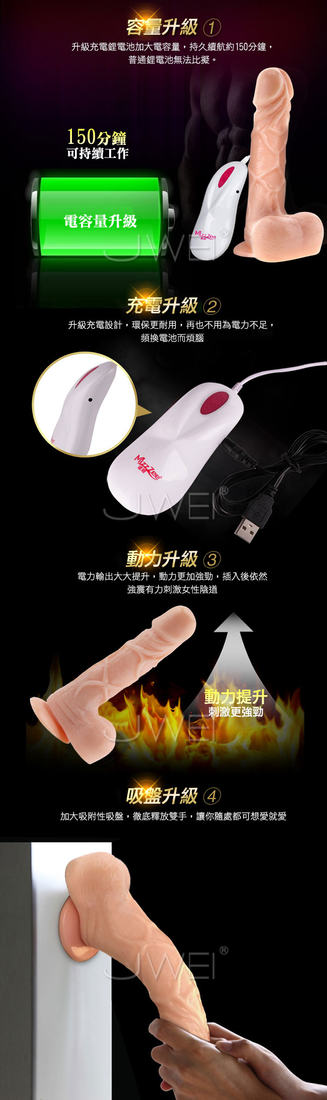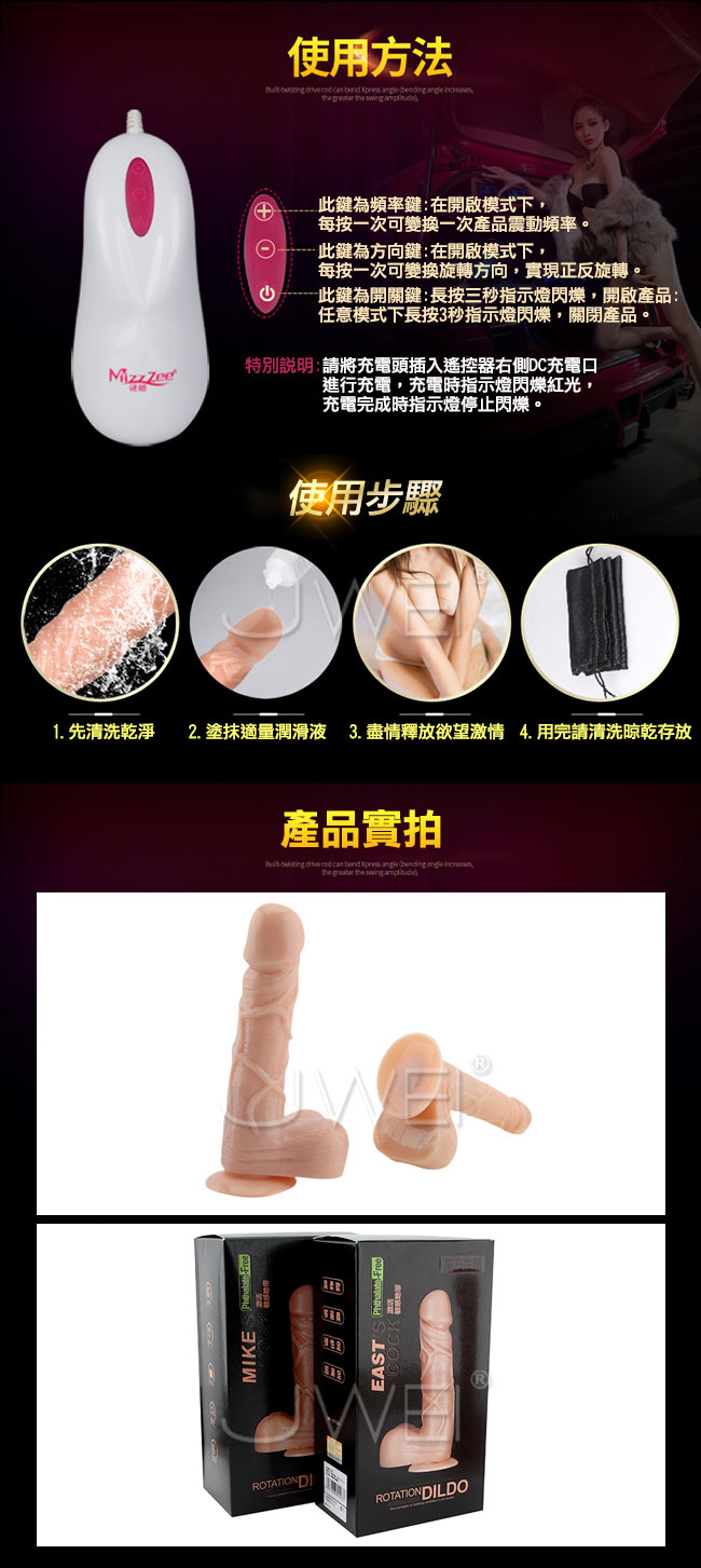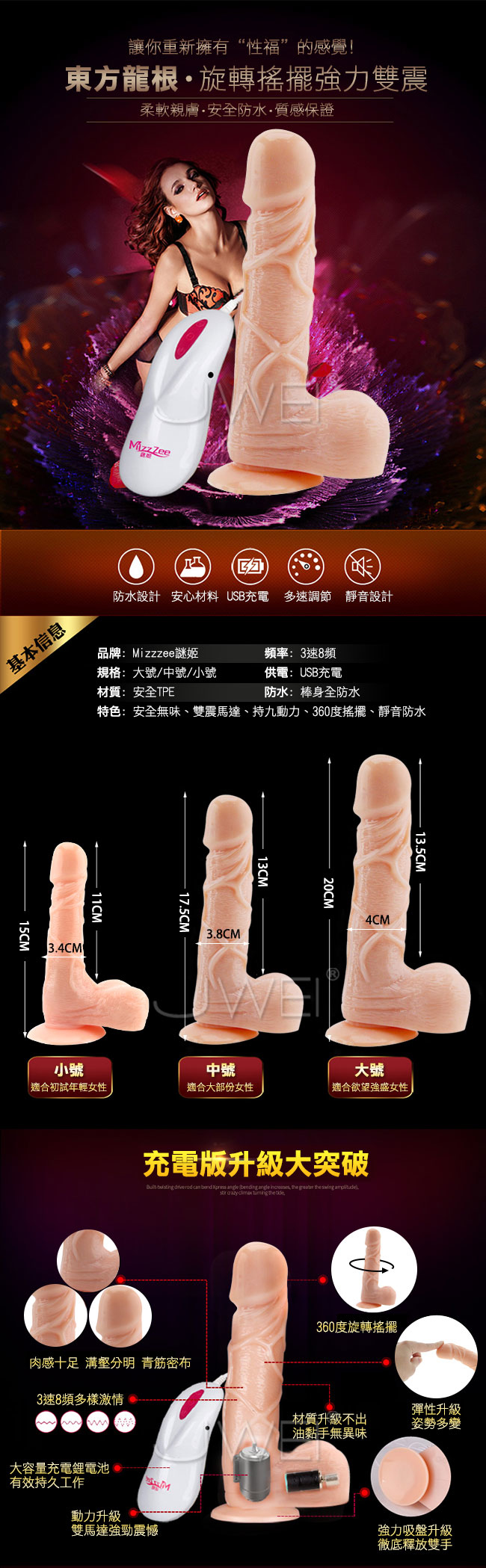 東方龍根讓您重新擁有性福!逼真的肉棒設計採用柔軟親膚矽膠肉感十足、溝壑分明加上青筋密佈,給您最真實的感覺!並且動力再升級,強勁的動力搭配360度旋轉搖擺,有效刺激您的蜜穴帶給您顫慄的快感潮水不停的流~擁有3檔速度及8段變頻多樣的激情變化享受不同的性愛模式,升級後的超大容量鋰電池能更有效的持久工作,讓愛能持續不間斷喔!底坐的吸盤設計吸附性強大,可以徹底釋放您的雙手,不管是在浴室裡、鏡子前或是地板上讓您想愛就愛。質感再升級無意味超柔軟肉棒能隨意彎曲多種姿勢任意選擇!