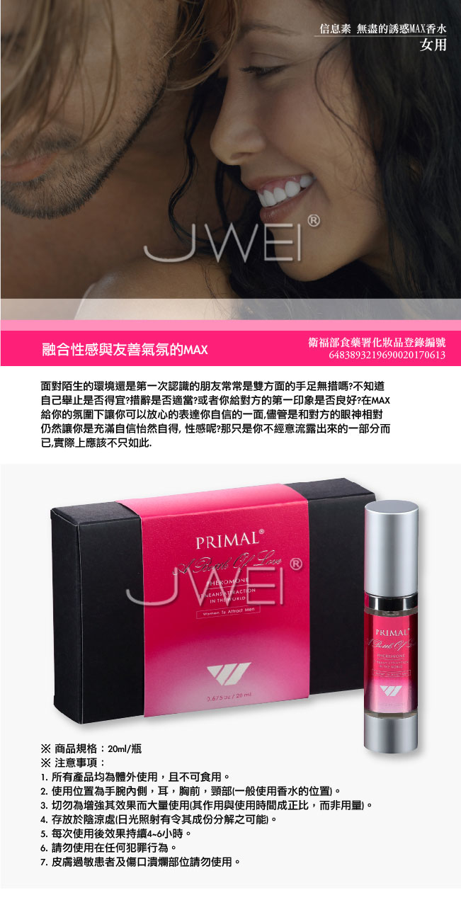 信息素原液無色無味,未經驗證的高純度的信息素原液不適合在市場販賣,本產品以最接近人體自然分泌之信息素配方,經台彎工研院驗證質量確實,Primal系列為亞洲地區信息素最暢銷之產品,讓您對異性散發永恆的魅力!