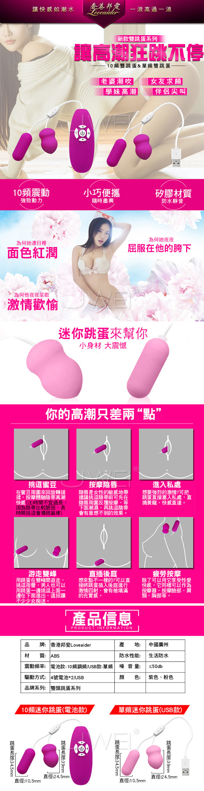 香港邦愛Loveaider.單頻USB直充防水雙跳蛋-粉色(子彈型+葫蘆型)